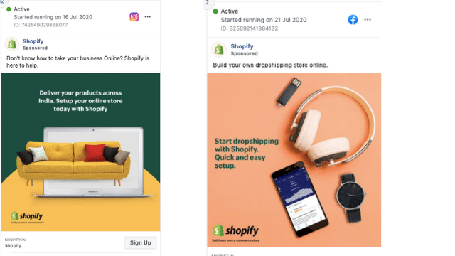 Shopify uses these ads in India. They describe their benefits in a simple way. Delivery, drop shipping. One ad, One Benefit.